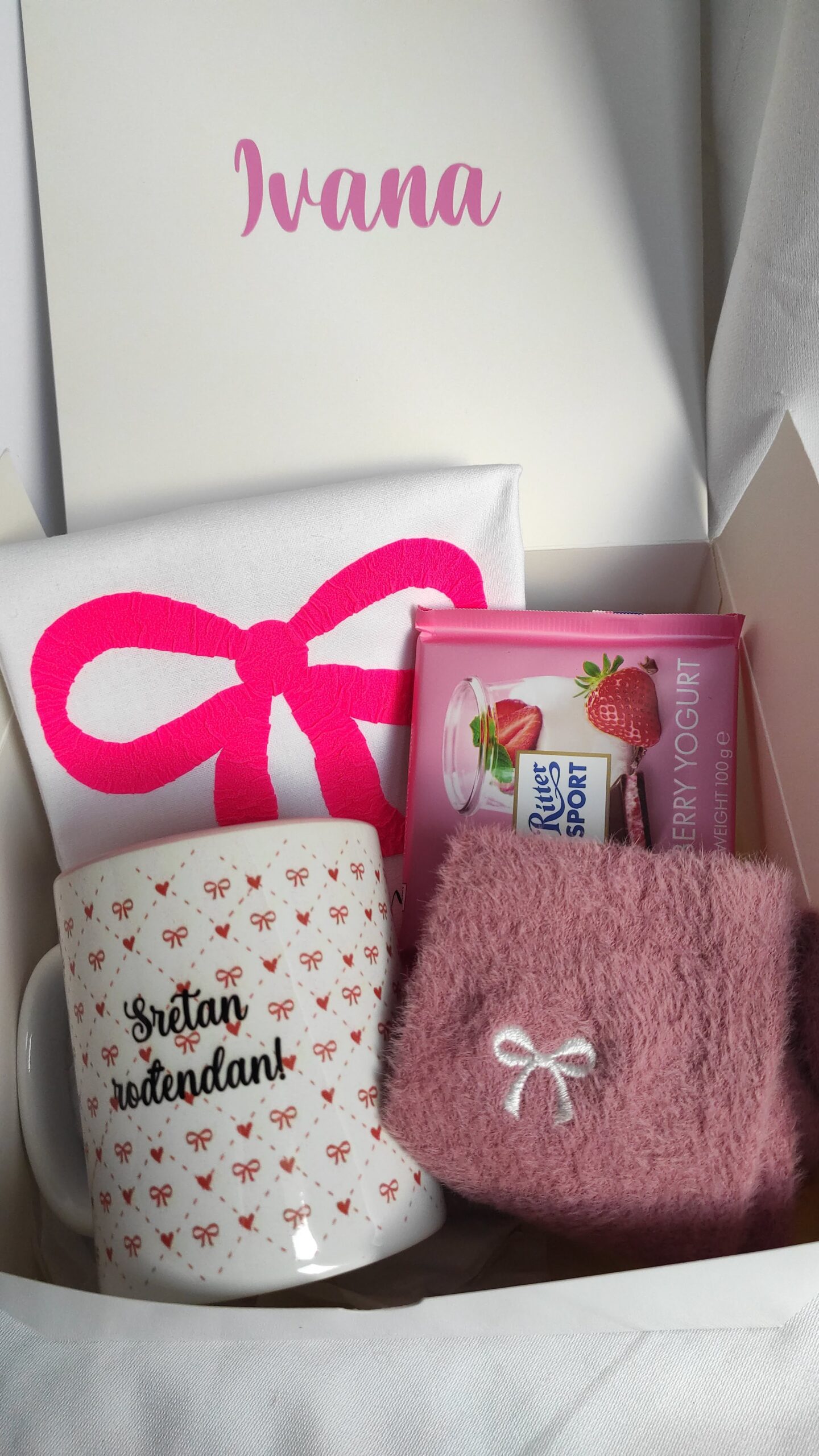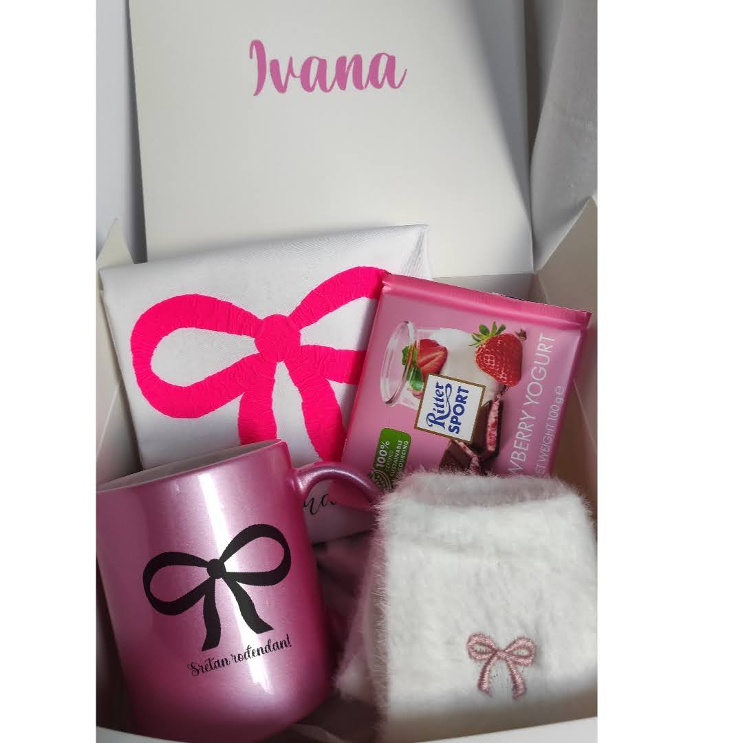Elegantni rođendanski set u nježnim tonovima ružičaste, s motivom mašne i inspirativnim porukama. Ručno izrađen s pažnjom na svaki detalj – savršen poklon za sretan dan tvoje sestre, prijateljice ili kolegice.