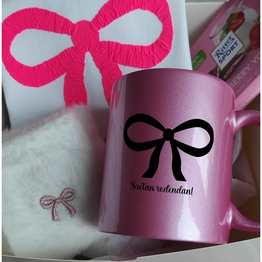 ✓ Šalica s motivom mašne i natpisom “Sretan rođendan”